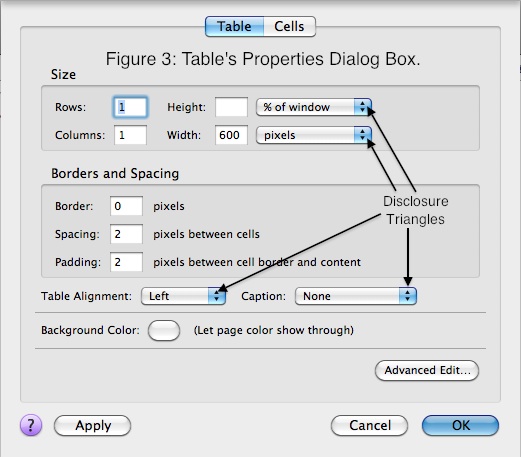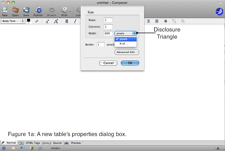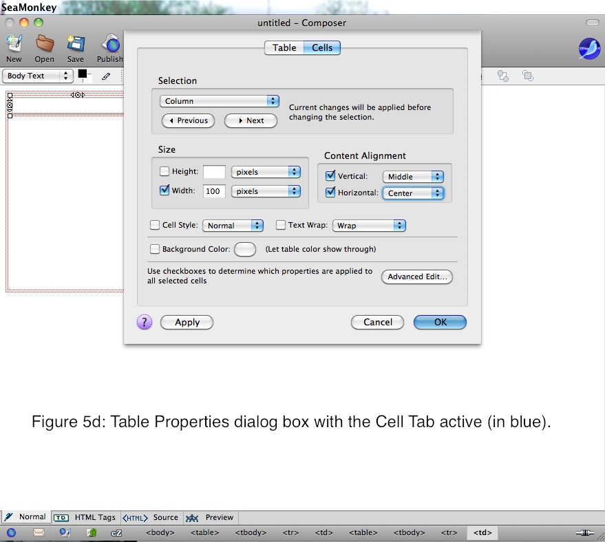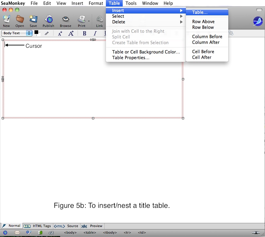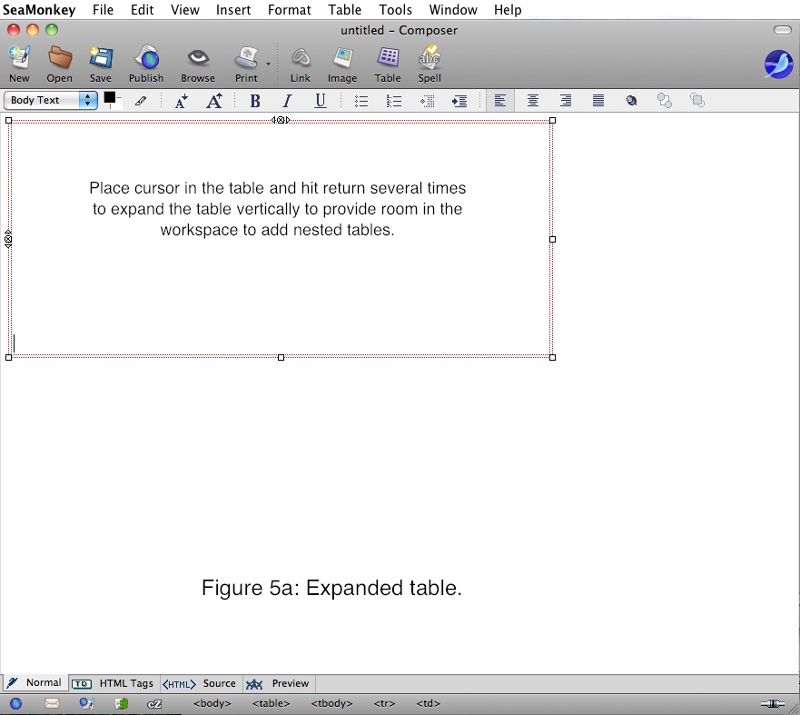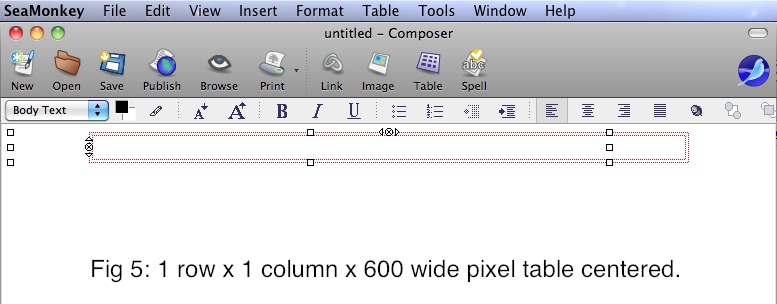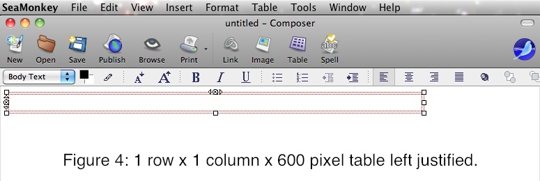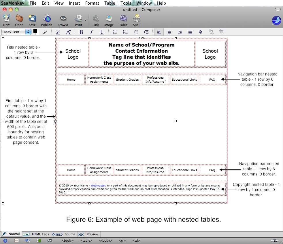 A good rule of thumb for web pages is simplicity. For the most part, keep your pages small enough so that browsers do not have to scroll very much if at all. Reading from a computer screen is about 25% slower than paper and it is recommended that you endeavor to use 50% fewer words. Take some time to download review the PowerPoint Presentation by Patrick Crispen, “Guidelines for GOOD Web Design.” Check out Jakob Neilson's web site useit.com. This site provides information regarding user-friendly web design. The goal of this course is to provide enough training, guidance and resources to help you build and maintain a functional and professional web site. I have gathered a variety of resources (web based as well as on-line documentation) to help you start a sustainable classroom web site. A fundamental management issue is directory structure. This includes the naming and organizing of files and folders for your web site. When creating files and folders, use short names (abbreviated) and keep them in lower case. Web page documents will end in .html or .htm. Images will end with .jpg (JPEG) or .giff. Again, I cannot stress the importance of short but identifiable names. Do not use capital letters or unusual characters such as %, &, *, # etc. Your home page, the page web browsers see first when they visit your web site will be named, “index.html”. Browsers, such as Netscape, SeaMonkey, Opera, Camino, Internet Explorer and Safari, look for this file to display first. Next is to create a main folder that will contain all resources, files and images, for your web site. Inside of the main folder create another folder and label it, “images.” This will be where you will place all the images you use for your web site. The key to all of this is that all resources for your web site need to be placed in the main folder. You can put this folder in your computer’s Documents folder or on your desktop. Normally, I call this main folder, kzwbst that is the abbreviation for, Keith Zamudio Web Site. Figure 1 is a labeled image of a new document in Composer. To open a new document in Composer is a two-step process. First launch SeaMonkey. Once SeaMonkey has launched, there are a few ways to open a new Composer page. The second step is to select Window from the menu bar and navigate to Composer. When you select Composer, a blank window (much like a new document window in a word processor, Figure 1) with a Tool Bar at the top will appear. Another easy method is to click on Composer’s icon in the lower left hand corner of SeaMonkey's browser’s window Figure 2. To open an existing document in Composer is a three-step process. Launch SeaMonkey and Composer as described above – steps 1 and 2. When you have a blank window in Composer, you can open an existing document (Step 3) by clicking File from the menu bar and selecting Open File. You will then be presented with an Open HTML File dialog box. Navigate to and select the existing document you wish to open and click Open. Another option on the tool bar of any open HTML file is an Open icon on the tool bar that will open an existing HTML file. Next we will build the underlying structure for your web site so that you can control how the information will be displayed. To accomplish this we will use tables. Tables are useful and many web sites use tables to organize text and pictures. With a new Composer page open (Figure 1), click on the Tables icon in the tool bar. This will display the table’s properties dialog box (Figure 1a). The first table we will make will be 1 row by 1 column. Change the width of the table to 600 pixels. You will need to click on the disclosure triangles (Figure 1a) to select pixels. The table will have 0 for Border. Click OK. Figure 4 shows a table with no border, is 1 row by 1 column and is left justified for the browser window. To center the table (Figure 5) in the browser window, click on the table in your workspace one time (you will see the black handles) and click on the Table icon in the Tool Bar to access selected table’s properties. You will then get the table’s properties dialog box (Figure 3). Adjust the table’s alignment by clicking on the disclosure triangles for Table Alignment. Enter values of 2 for Spacing and 5 for Padding (Figure 3). You will learn to manipulate the numbers for spacing and padding as you use more tables. Table Alignment can be left or centered depending on your preferences. Click OK. Now is a good time to save. Initially, this is a two-step process. First you will provide a title that will appear in the title bar of the browser window. Title should be short, descriptive and use the standard conventions of writing for titles. Then you will be asked for a name for the file. This file will be stored in the main directory of the web site. Please review the naming conventions described earlier. So that you can control how information and images will be displayed, you can nest tables within tables. We will do that now as we continue to establish the underlying structure for your web site. This is where your planning (story board) will be of benefit. Figure 6 is an example of a web page with nested tables. Figure 6 has a total of five tables. One table (the first table we made that is 1 row by 1 column with the height set at the default value, and the width of the table set at 600 pixels) acts as a border to contain the information and the remaining 4 tables are used for title space, navigation bars, and copyright info. To accomplish this layout, place the cursor in the table we just created. Hit return several times to expand the table vertically (Figure 5a). This will give us room in the workspace to add more tables. To insert/nest the title table (Figure 5b), place the cursor at the top of your 1 x 1 table. Select Insert from the Table menu and choose Table from the submenu. The Table Properties dialog box will appear (Figure 5c). Make this table 1 row by 3 columns and 0 for border. Th